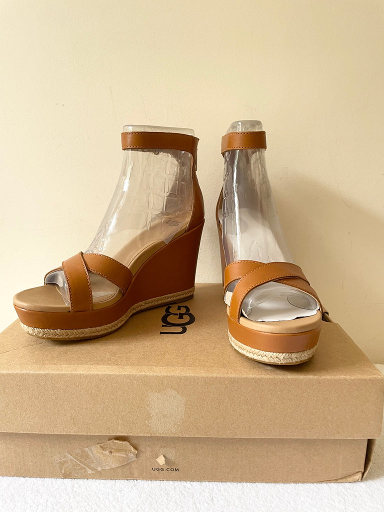 BRAND NEW UGG EZRAH TAN LEATHER WEDGE HEEL SANDALS SIZE 5/38