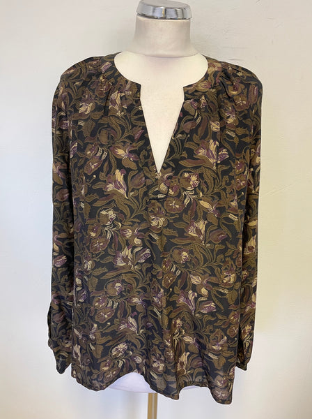 BRORA NAVY, BROWN & PURPLE FLORAL PRINT 100% SILK LONG SLEEVED BLOUSE