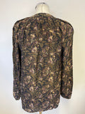 BRORA NAVY, BROWN & PURPLE FLORAL PRINT 100% SILK LONG SLEEVED BLOUSE SIZE 8-10