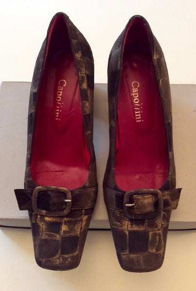 CAPOLLINI BROWN & GOLD PRINT BUCKLE TRIM HEELS SIZE 5.5/38.5