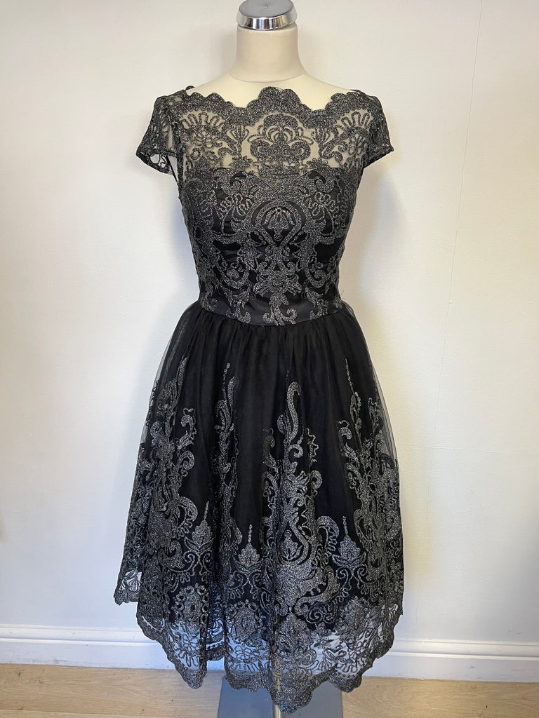 BRAND NEW CHI CHI LONDON BLACK & SILVER LACE OVERLAY FIT & FLARE SPECIAL OCCASION DRESS SIZE 8