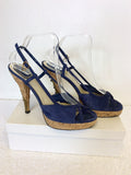 5 INCH CORK HEELS WITH GOLD CHAIN AND BLUE & GOLD BEAD TRIMS TO BACK