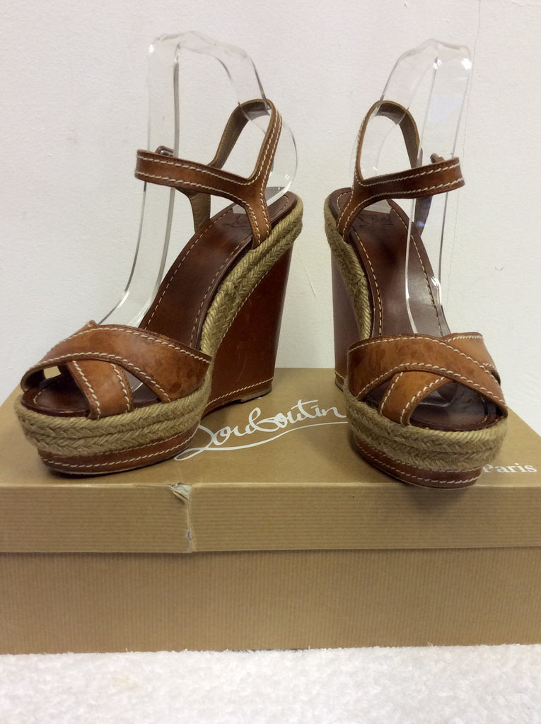 CHRISTIAN LOUBOUTIN TAN LEATHER WEDGE HEEL SANDALS