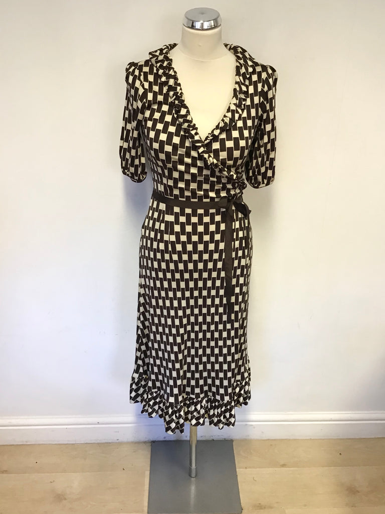 COAST BROWN & CREAM PRINT SILK SHORT SLEEVE WRAP AROUND DRESS SIZE 12