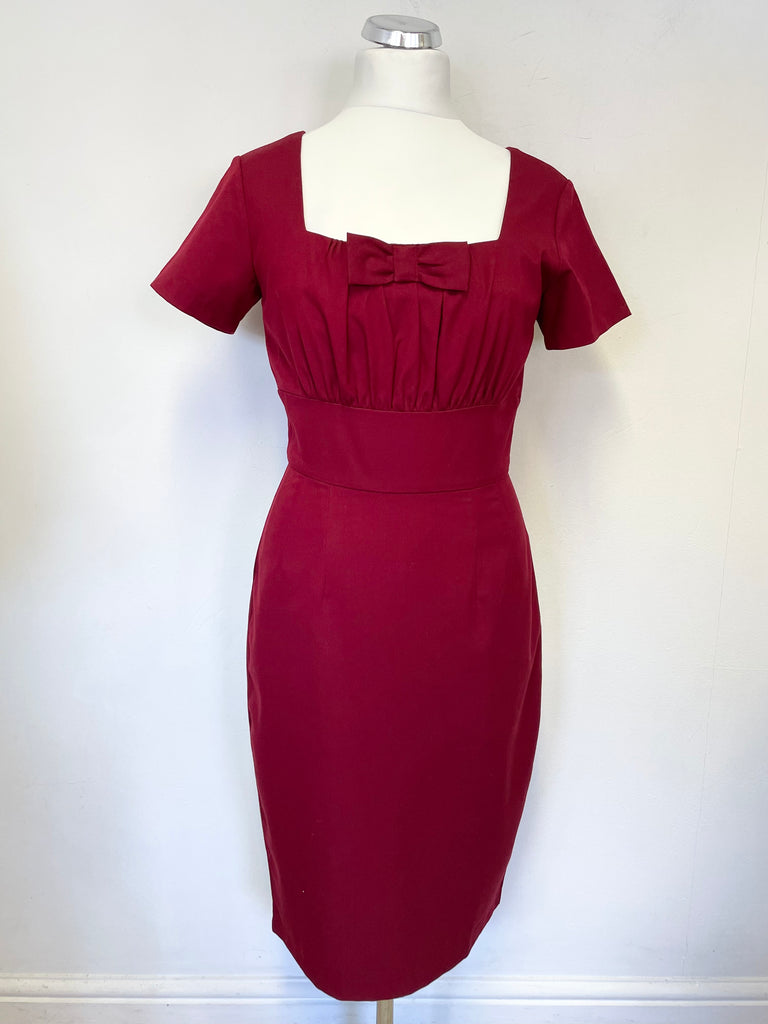 DAISY DAPPER RETRO CLOTHING DARK RED BOW TRIM SHORT SLEEVE PENCIL DRESS SIZE L