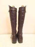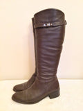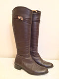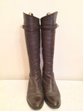 DARK BROWN LEATHER SILVER POSTMAN LOCK STRAP TRIM KNEE LENGTH BOOTS SIZE 6/39