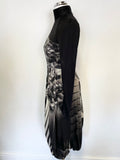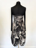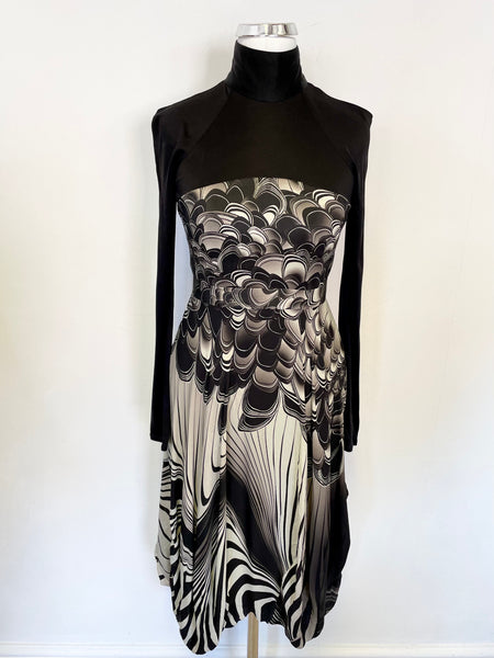DESIGNER SARAH ARNETT BLACK & GREY PRINT SILK LONG SLEEVE BUBBLE HEM DRESS SIZE XS UK 6/8