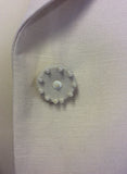 SILK & LINEN JACKET HAS COLLAR WITH V NECKLINE WITH 4 BUTTON FASTEN TO FRONT ( ONE BUTTON HAS A FEW PEARL BEADS MISSING)