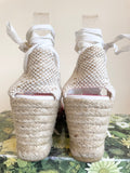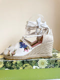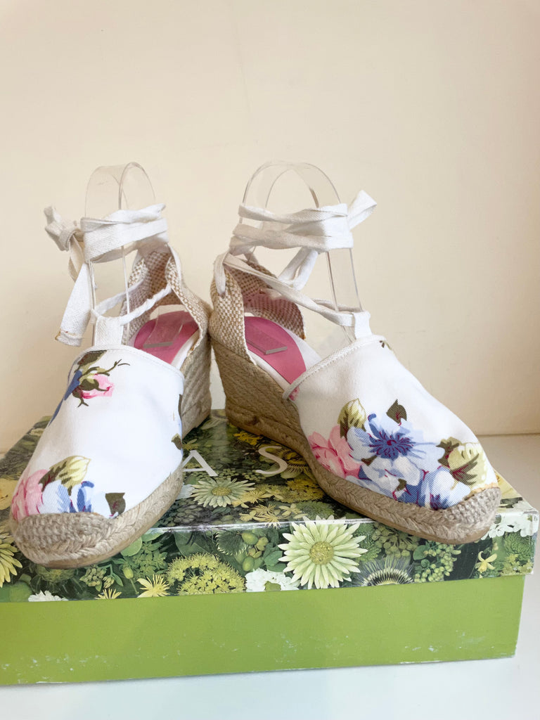EAST WHITE FLORAL PRINT WEDGE HEEL ESPADRILLE LACE UP LEG SANDALS SIZE 5/38