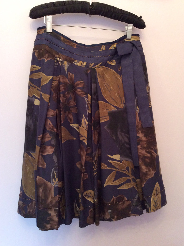 Essentiels Antwerp Dark Blue & Brown Floral Print Silk Skirt Size 12