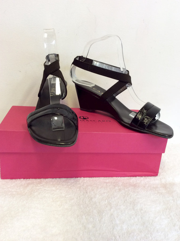 JAIME MASCARO BLACK PATENT LEATHER STRAPPY WEDGE HEEL SANDALS