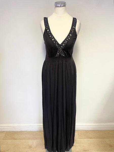 JIGSAW CHARCOAL SILK BLEND JEWEL TRIMMED SLEEVELESS MAXI DRESS SIZE XS