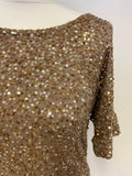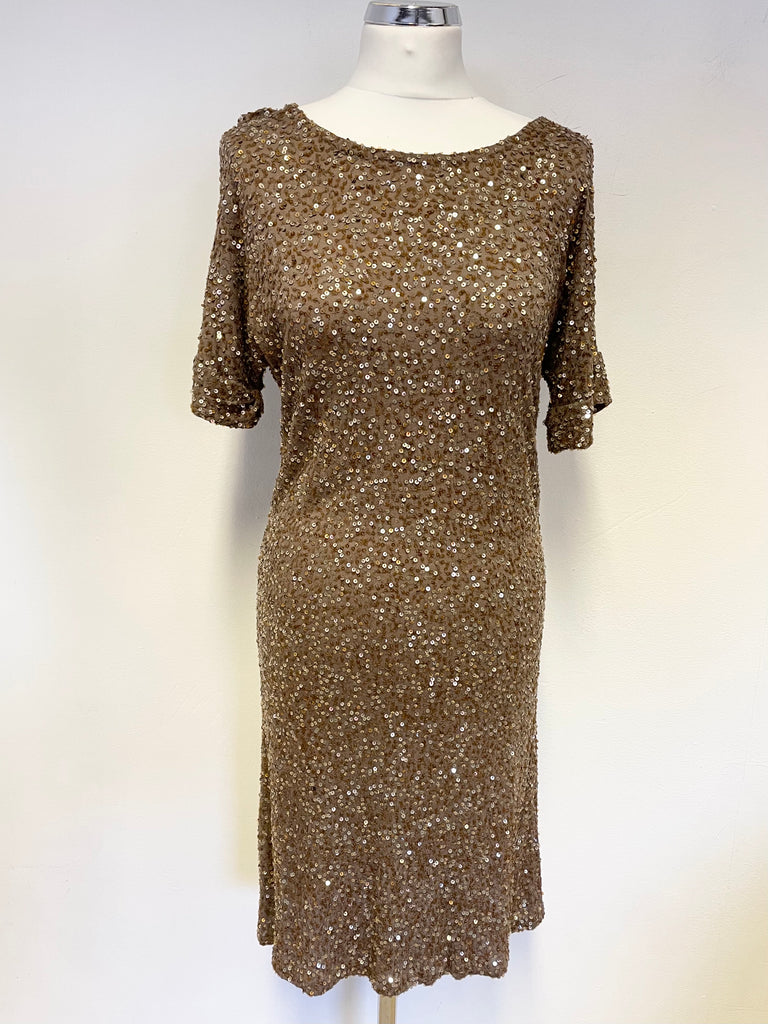 JIGSAW LIGHT BROWN & GOLD SEQUINNED SHORT SLEEVE SHIFT DRESS SIZE S