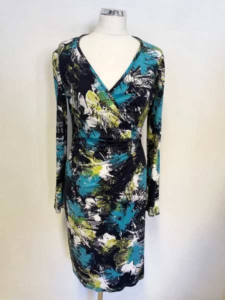 JOSEPH RIBKOFF TURQOUISE PRINT LONG SLEEVE STRETCH JERSEY DRESS SIZE 12
