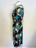 JOSEPH RIBKOFF TURQUOISE ,GREEN,BLACK & WHITE PRINT STRETCH JERSEY DRESS