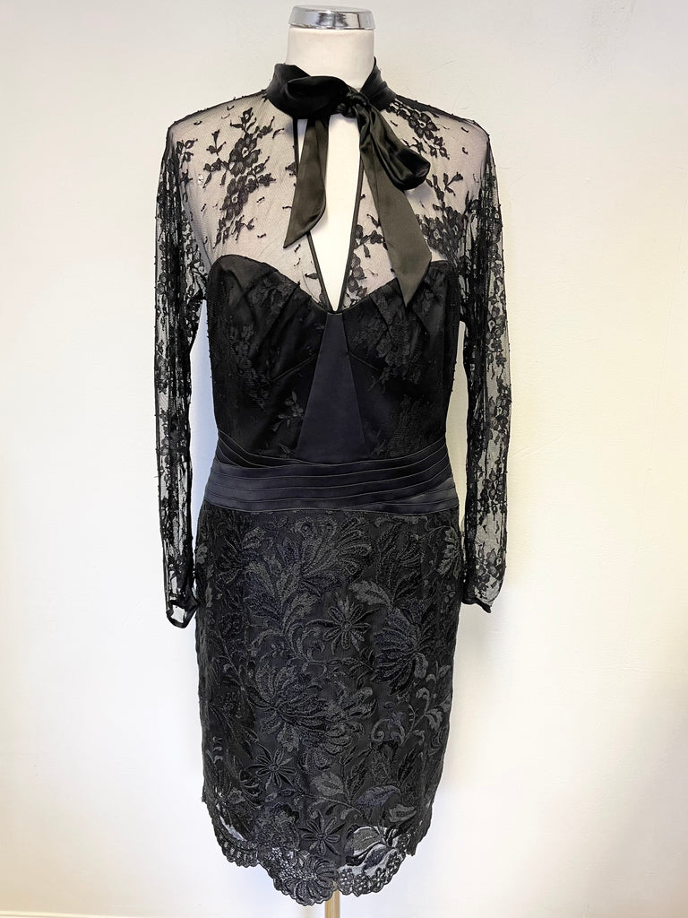 KAREN MILLEN BLACK LACE & SILK TRIMMED LONG SLEEVED PENCIL DRESS SIZE 14