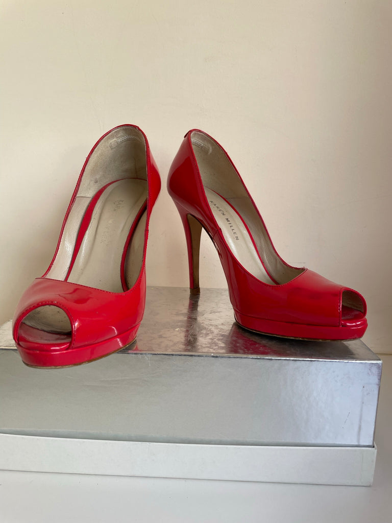 KAREN MILLEN RED PATENT LEATHER PEEPTOE HEELS