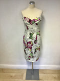 KAREN MILLEN WHITE & MULTI COLOURED BUTTERFLY PRINT STRAPLESS DRESS SIZE 14