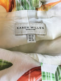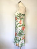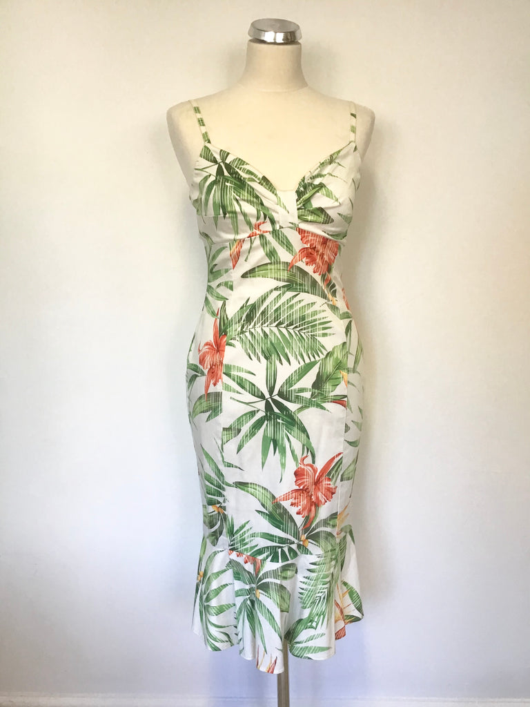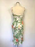 KAREN MILLEN WHITE, ORANGE & GREEN TROPICAL PRINT STRAPPY PENCIL DRESS SIZE 10/12