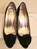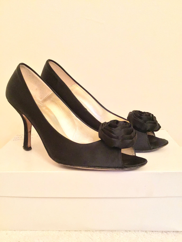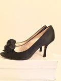 LK BENNETT SOFFI BLACK SATIN PEEP TOE FLOWER TRIM HEELS SIZE 6/39