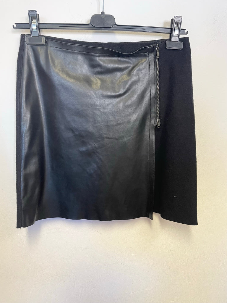 MARCCAIN BLACK WOOL & FAUX LEATHER WRAP FRONT SKIRT SIZE 3 UK 12/14