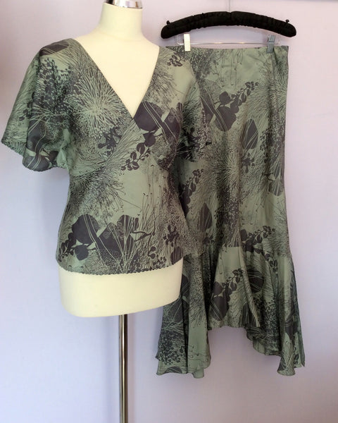 Monsoon Grey & Green Silk Print Top & Long Skirt Size 12
