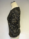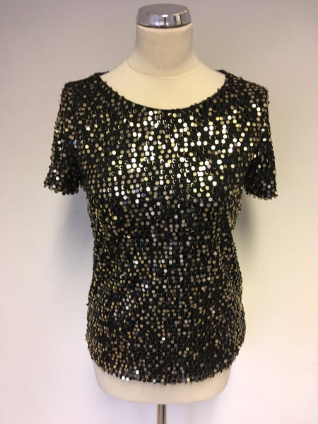 PHASE EIGHT BLACK & GOLD SEQUINNED SHORT SLEEVE TOP SIZE 10
