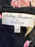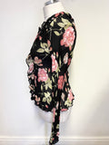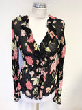 PHASE EIGHT BLACK & PINK FLORAL FRILL TRIM LONG SLEEVE BLOUSE SIZE 12