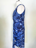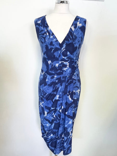 PHASE EIGHT BLUE PRINT DRAPED STRETCH JERSEY SLEEVELESS PENCIL DRESS SIZE 14