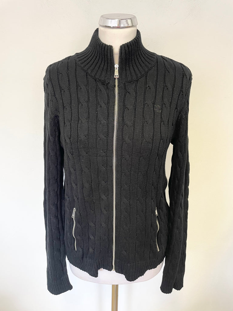 RALPH LAUREN BLACK CABLE KNIT LONG SLEEVED ZIP UP CARDIGAN SIZE L