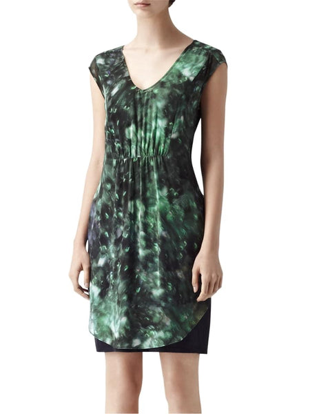 REISS BLACK & GREEN PRINT SILK FRONT OVERLAY SLEEVELESS PENCIL DRESS