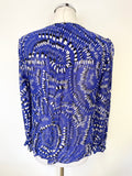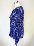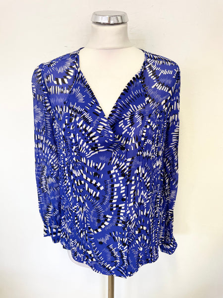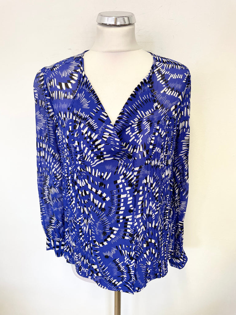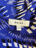 REISS DANIELLA ROYAL BLUE, BLACK & WHITE PRINT LONG SLEEVED BLOUSE SIZE 10