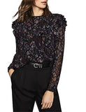 REISS FAIZA BLACK FLORAL PRINT RUFFLE TRIM LONG SLEEVED TOP