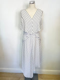 REISS RHONI IVORY & FINE BLACK STRIPE FIT & FLARE ASYMMETRIC HEM DRESS SIZE 12