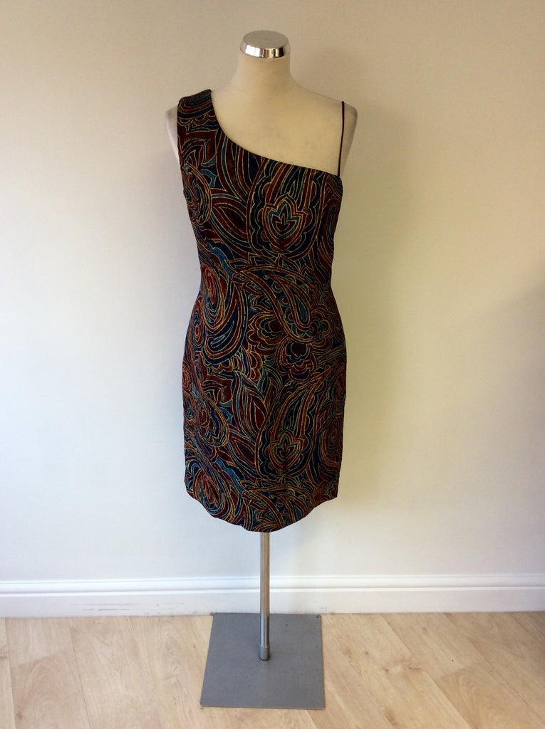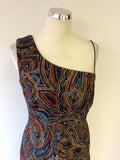 RONIT ZILKHA DARK BLUE,GREEN BROWNS,RED & GOLD PRINT ONE SHOULDER DRESS
