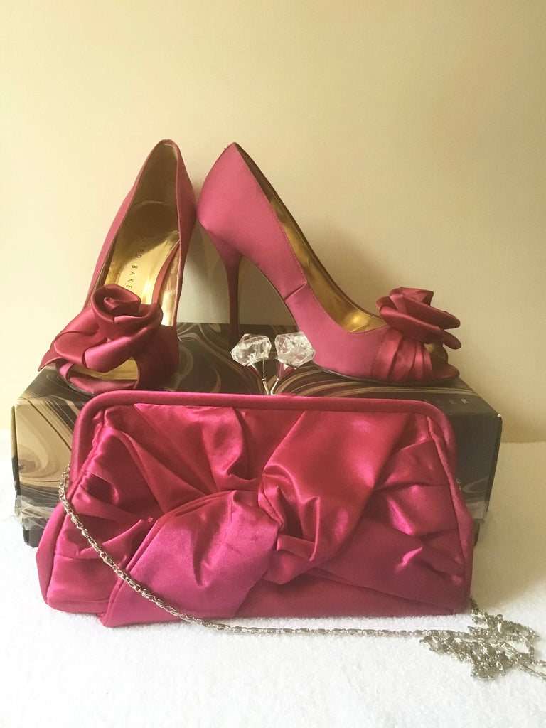 TED BAKER KEMINA ROSE FUSHIA PINK SATIN HEELS WITH FREE MATCHING CLUTCH/ SHOULDER BAG