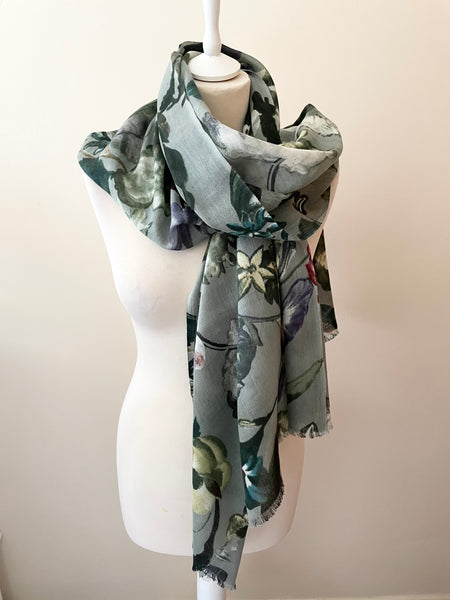 UN BRANDED GREEN FLORAL PRINT WOOL & COTTON BLEND SCARF/WRAP