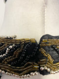 SILVER ,BLACK & BROWN BEADING TO EDGES TO TOP & FRONT OF NECK