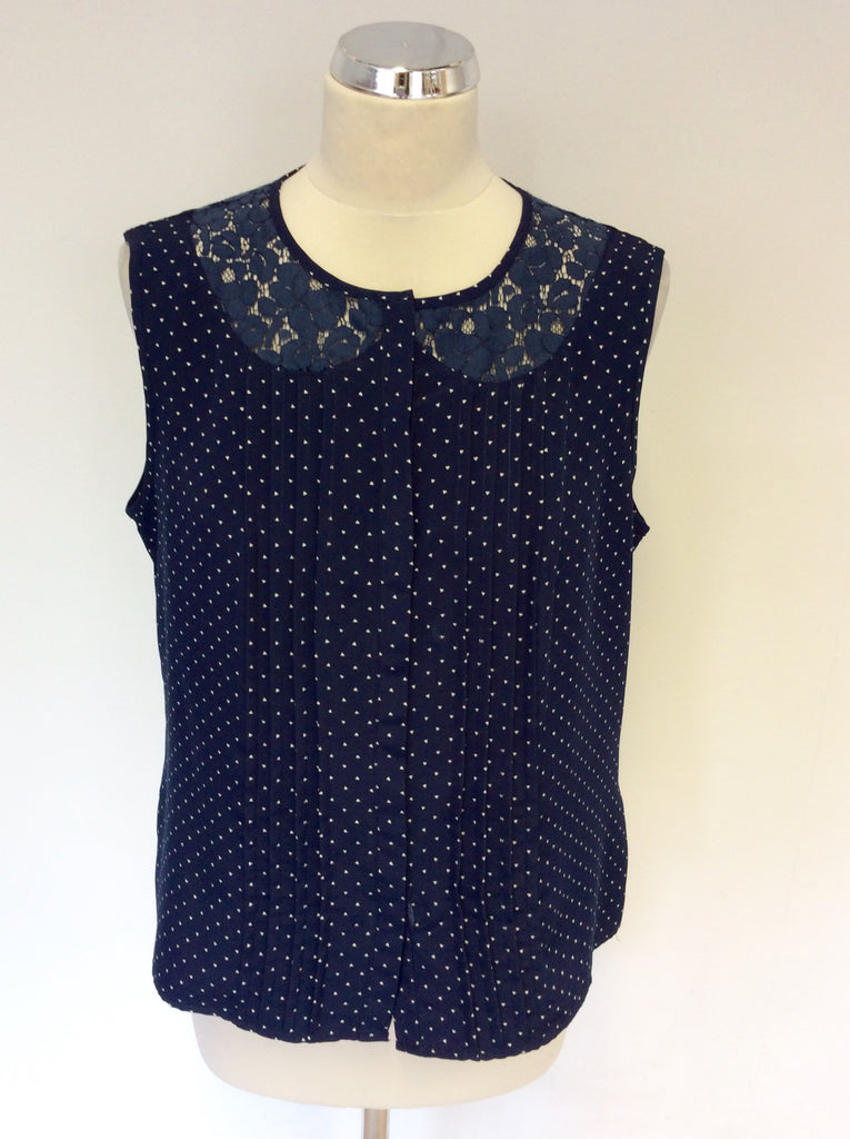 WHISTLES DARK BLUE & WHITE SPOT LACE TRIM TOP SIZE 12