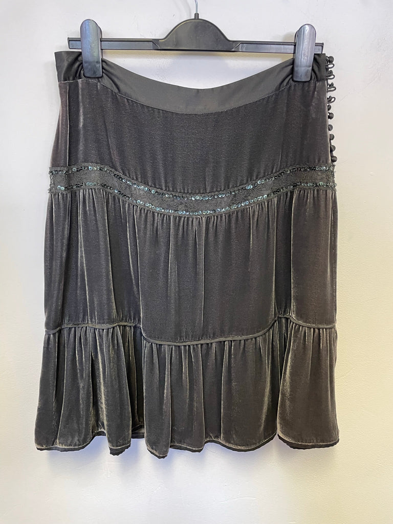 WHISTLES DARK GREEN LACE & SEQUIN TRIMMED VELVET TIERED SKIRT SIZE 10