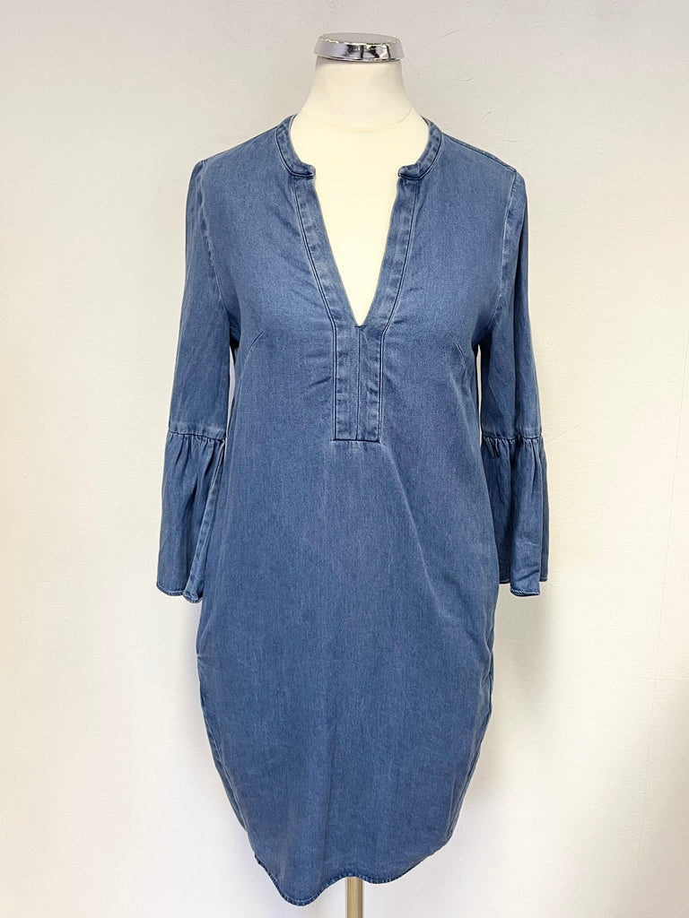 WHISTLES DENIM BLUE V NECK 3/4 FRILLED SLEEVE SHIFT DRESS SIZE XS