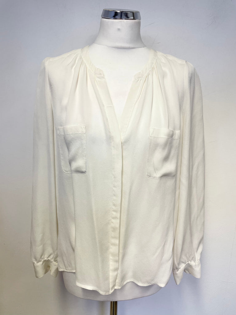 WHISTLES IVORY SILK COLLARLESS LONG SLEEVE BLOUSE SIZE 14