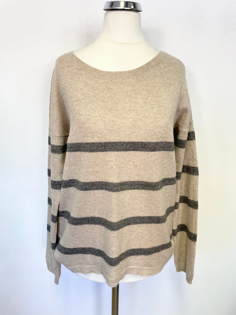 WYSE 100% CASHMERE BEIGE & GREY STRIPE LONG SLEEVED JUMPER